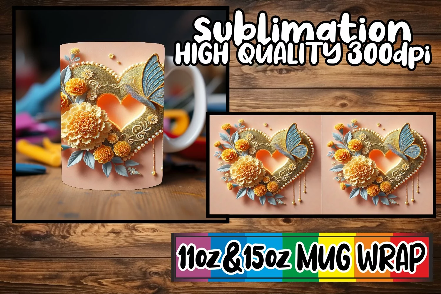 Tender love 11oz 15oz mug wrap, 3D Heart