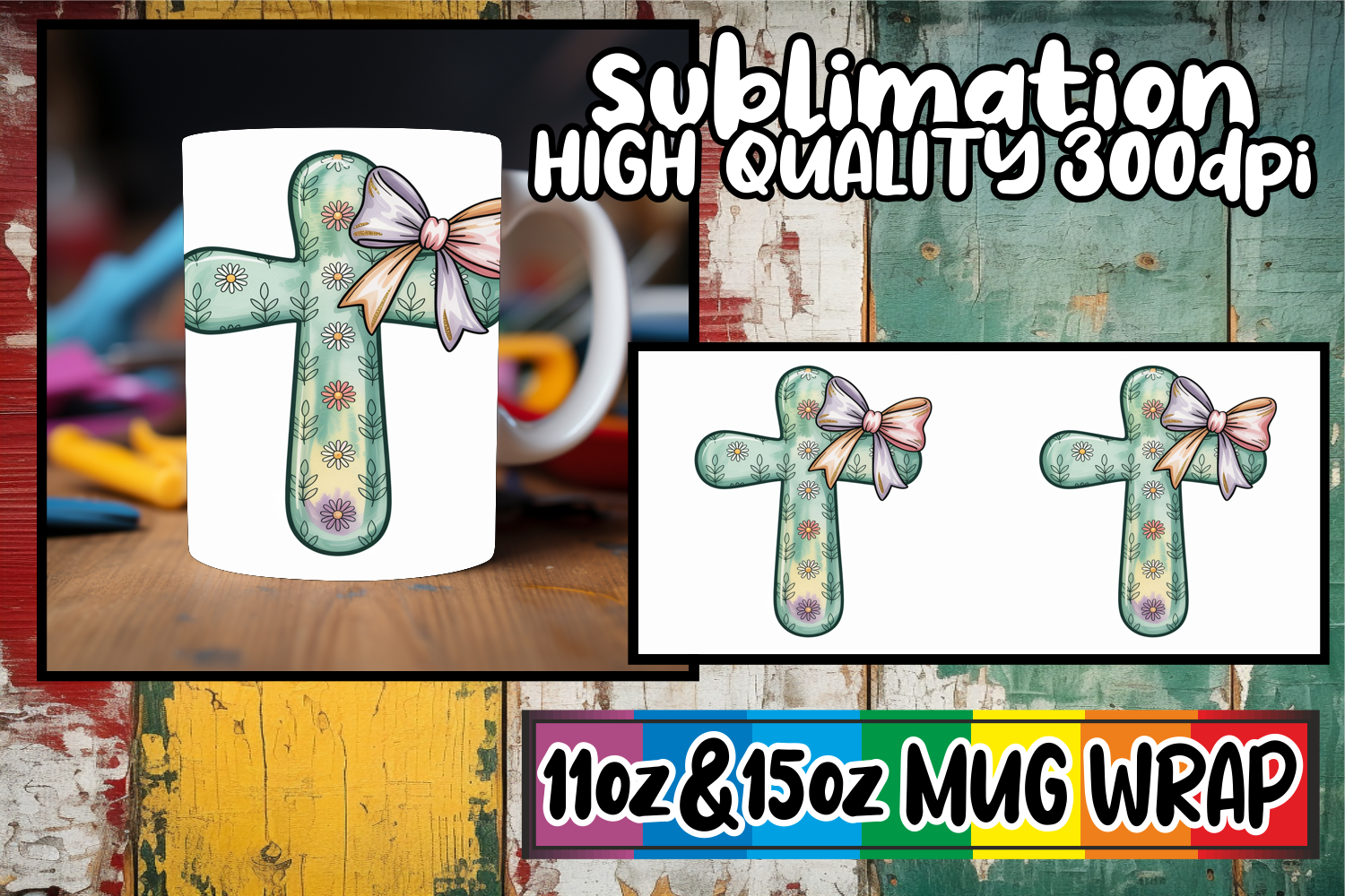 Similar Design Products to Glowing hearts 11oz 15oz mug wrap, Cross and Bow