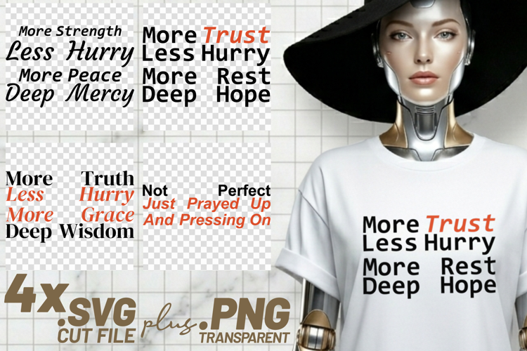 This bundle is perfect for anyone seeking uplifting and encouraging quotes. It includes four unique designs, each with a message of faith and positivity. The first design reads: "More Strength, Less Hurry, More Peace, Deep Mercy." The second design says: "More Trust, Less Hurry, More Rest, Deep Hope." The third design features the words: "More Truth, Less Hurry, More Grace, Deep Wisdom." Finally, the fourth design states: "Not Perfect, Just Prayed Up, And Pressing On." You'll receive SVG cut files, EPS files, and transparent PNG files. SVG and EPS files are vector formats, which means they can be scaled up or down without any loss of quality. This makes them ideal for cutting machines and editing software. EPS files are included as an alternative vector format for those who prefer them or use software that supports them. The transparent PNG files are perfect for sublimation, print-and-cut projects, and any design where you need a transparent background. These files are compatible with a wide range of cutting machines and software, including Cricut Design Space, Silhouette Cameo (with Silhouette Studio Designer Edition), Brother ScanNCut, and similar programs that support SVG, EPS, or PNG files. You can use these designs to create a variety of projects, such as t-shirts, mugs, tumblers, signs, decals, stickers, tote bags, greeting cards, and more. They're also great for sublimation blanks and various cutting machine projects. Please note that this is a digital download, and no physical product will be shipped. This is a digital download. No physical product will be shipped. You will receive 4 clean vector SVG cut files, 4 clean vector EPS files, and 4 transparent PNG files. SVG and EPS files are scalable vector formats that work well for cutting, editing, and resizing without losing quality. PNG files are perfect for sublimation, print-and-cut projects, and other transparent-background workflows. These files are suitable for Cricut Design Space, Silhouette Cameo and Silhouette Studio Designer Edition, Brother ScanNCut, Summa, and other software or machines that support SVG, EPS, or PNG formats.
