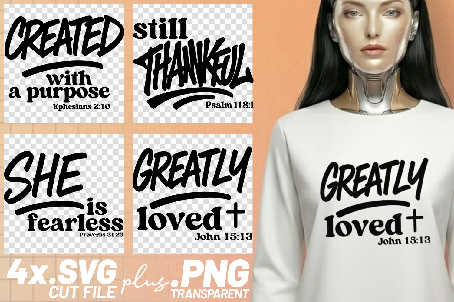 This bundle is perfect for anyone looking for inspiring quotes with a Christian theme. It includes four unique designs, each with a powerful message. These designs are ideal for creating uplifting projects for yourself or to share with others. Here's a look at what you'll find: Design 1 features the quote "CREATED with a purpose" along with the scripture reference Ephesians 2:10. Design 2 presents the words "still THANKFUL" and the scripture reference Psalm 118:1. Design 3 states "SHE is fearless" and references Proverbs 31:25. Design 4 reads "GREATLY loved +" with the scripture reference John 15:13. This bundle includes SVG, EPS, and PNG files. SVG and EPS files are vector files, which means they can be scaled to any size without losing quality. They are perfect for cutting machines and editing in design software. EPS files are included as an alternative vector format for those who prefer them. PNG files have transparent backgrounds, making them ideal for sublimation, print-and-cut projects, and other applications where a transparent background is needed. These files are compatible with a variety of cutting machines and design software, including Cricut Design Space, Silhouette Cameo (with Silhouette Studio Designer Edition), Brother ScanNCut, and similar machines that support SVG, EPS, or PNG files. Use these designs to create a variety of items, such as t-shirts, mugs, tumblers, signs, decals, stickers, tote bags, greeting cards, and more. They are also perfect for sublimation projects and cutting machine projects. This is a digital download, and no physical product will be shipped. This is a digital download. No physical product will be shipped. You will receive 4 clean vector SVG cut files, 4 clean vector EPS files, and 4 transparent PNG files. SVG and EPS files are scalable vector formats that work well for cutting, editing, and resizing without losing quality. PNG files are perfect for sublimation, print-and-cut projects, and other transparent-background workflows. These files are suitable for Cricut Design Space, Silhouette Cameo and Silhouette Studio Designer Edition, Brother ScanNCut, Summa, and other software or machines that support SVG, EPS, or PNG formats.