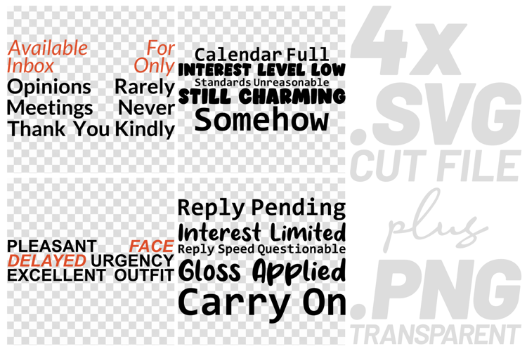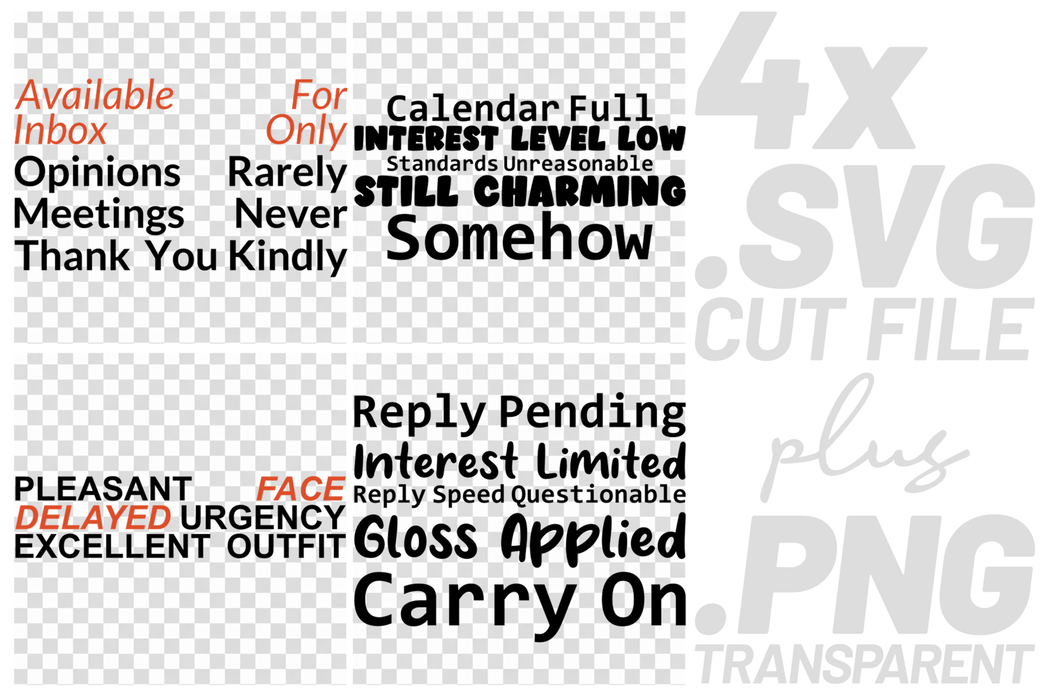 This bundle includes four unique quote designs, perfect for adding a touch of humor to your projects. These designs are ideal for anyone who appreciates witty sayings and wants to add some personality to their creations. Design 1 features a list of words: "Available, Inbox, Opinions, Meetings, Thank You Kindly" on the left and "For Only, Rarely, Never" on the right. Design 2 features "Calendar Full, INTEREST LEVEL LOW, Standards Unreasonable, STILL CHARMING, Somehow." Design 3 features "PLEASANT FACE, DELAYED URGENCY, EXCELLENT OUTFIT." Design 4 features "Reply Pending, Interest Limited, Reply Speed Questionable, Gloss Applied, Carry On." You'll receive SVG cut files, EPS files, and transparent PNG files. SVG and EPS files are vector formats, allowing you to resize them without any loss of quality. EPS files are included as an alternative vector format for those who prefer them. PNG files have transparent backgrounds, perfect for sublimation or print-and-cut projects. These files are compatible with a variety of cutting machines and design software, including Cricut Design Space, Silhouette Cameo, Silhouette Studio Designer Edition, Brother ScanNCut, and similar programs that support SVG, EPS, or PNG files. Use these designs to create custom shirts, mugs, tumblers, signs, decals, stickers, tote bags, cards, or other cutting machine projects. This is a digital download; no physical product will be shipped. This is a digital download. No physical product will be shipped. You will receive 4 clean vector SVG cut files, 4 clean vector EPS files, and 4 transparent PNG files. SVG and EPS files are scalable vector formats that work well for cutting, editing, and resizing without losing quality. PNG files are perfect for sublimation, print-and-cut projects, and other transparent-background workflows. These files are suitable for Cricut Design Space, Silhouette Cameo and Silhouette Studio Designer Edition, Brother ScanNCut, Summa, and other software or machines that support SVG, EPS, or PNG formats.