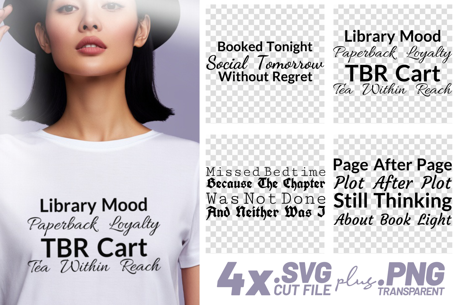 This bundle is for all the bookworms out there! These four designs are perfect for anyone who loves to read, adores libraries, and can't get enough of a good book. Express your love of reading with these fun quote designs. Design 1 says, "Booked Tonight, Social Tomorrow, Without Regret." Design 2 reads, "Library Mood, Paperback Loyalty, TBR Cart, Tea Within Reach." Design 3 says, "Missed Bedtime, Because The Chapter Was Not Done, And Neither Was I." Design 4 says, "Page After Page, Plot After Plot, Still Thinking, About Book Light." You'll receive four SVG cut files, four EPS files, and four transparent PNG files. SVG and EPS files are vector formats that allow you to resize and edit without losing quality. EPS is included as an alternative vector format for buyers or software that prefer EPS. PNG files are great for sublimation, print-and-cut, and other projects where a transparent background is needed. These files are compatible with a variety of cutting machines and design software, including Cricut Design Space, Silhouette Cameo, Silhouette Studio Designer Edition, Brother ScanNCut, and similar software that supports SVG, EPS, or PNG files. Use these designs to create shirts, mugs, tumblers, signs, decals, stickers, tote bags, cards, and more. They are also perfect for sublimation projects and cutting machine projects. This is a digital download; no physical product will be shipped. This is a digital download. No physical product will be shipped. You will receive 4 clean vector SVG cut files, 4 clean vector EPS files, and 4 transparent PNG files. SVG and EPS files are scalable vector formats that work well for cutting, editing, and resizing without losing quality. PNG files are perfect for sublimation, print-and-cut projects, and other transparent-background workflows. These files are suitable for Cricut Design Space, Silhouette Cameo and Silhouette Studio Designer Edition, Brother ScanNCut, Summa, and other software or machines that support SVG, EPS, or PNG formats.