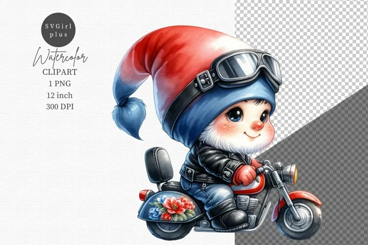 Gnome biker, Fantasy clipart, Watercolor clipart,
