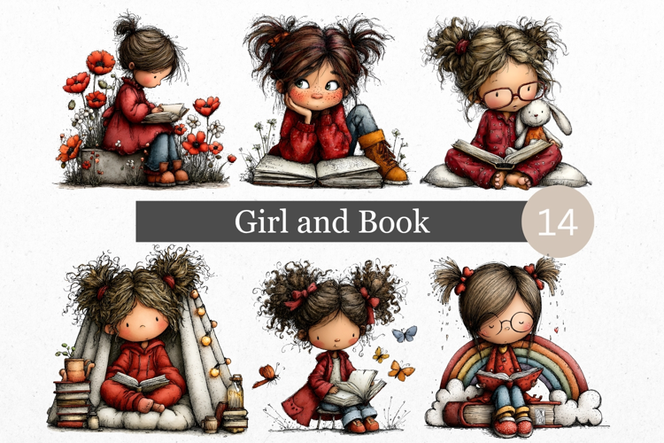 Girl With Book, Reading Clipart, Whimsical example image 1