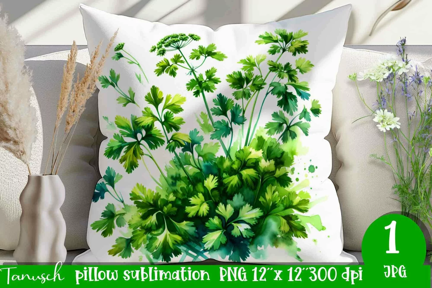 CORIANDER pillow sublimation / watercolor herbs garden PNG