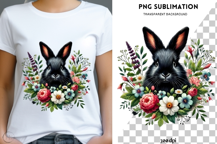 Black rabbit with flowers png design for T-shirts example image 1
