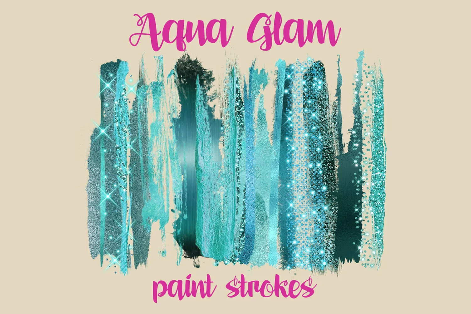 The AQUA GLAM clipart, graphics pack of 36 digital clipart PNG paint strokes in a rich range of aqua to teal color.
