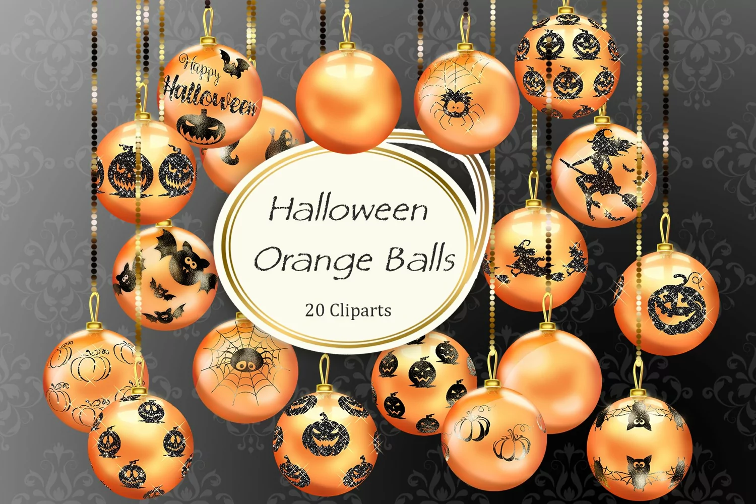 The HALLOWEEN ORANGE BALLS, graphics pack of 20 digital images contains shiny and sparkling orange Halloween ball ornaments in a variety of patterns. The strands are included as separate from the baubles.