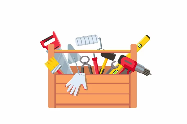 Toolbox with equipment. Wooden toolkit box with saw, drill, brush trowel and building level. House repair tools. Maintenance vector concept. Illustration box construction, equipment hammer and saw