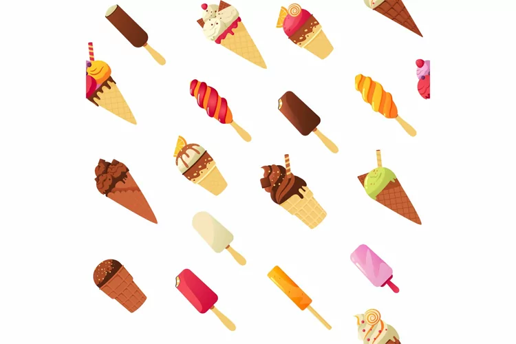 Cartoon ice cream pattern. Seamless print of colorful ice pop sweet cold dessert of different shapes and flavors. Vector summer ice cream texture. Different tastes as pistachio, chocolate and vanilla