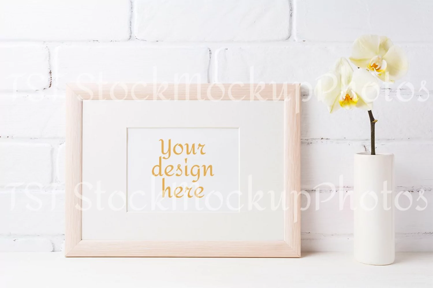 Wooden landscape frame mockup with soft yellow orchid example image 1