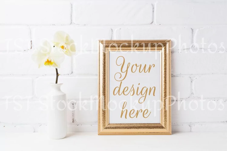 Golden  frame mockup with soft yellow orchid in vase example image 1