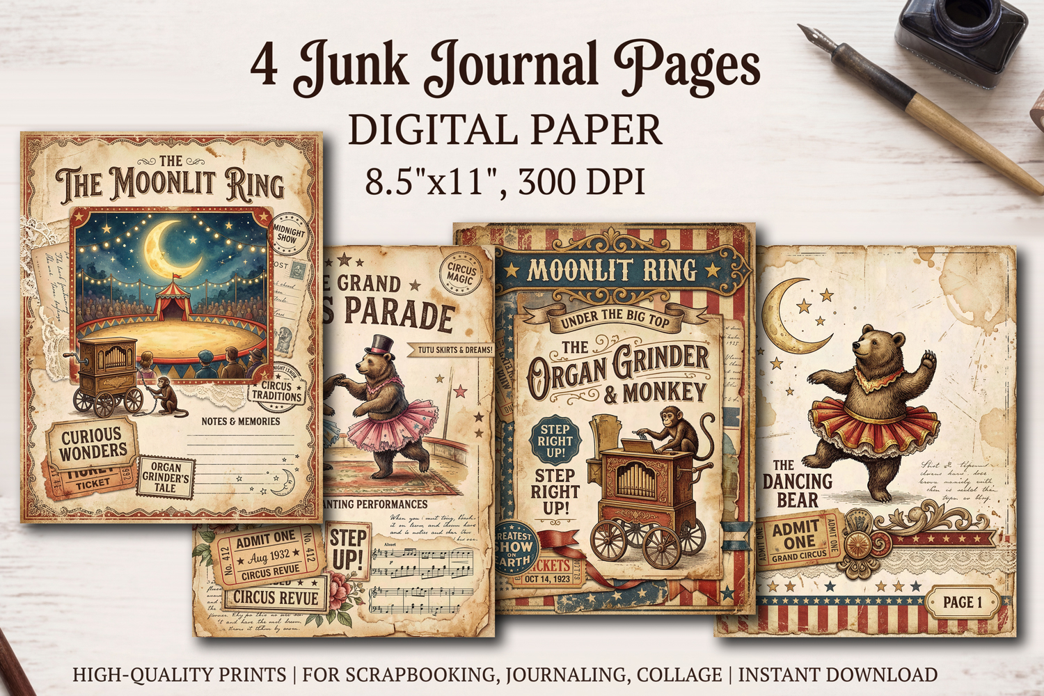 Add enchanting whimsy and charm to your creative projects with this printable set of 4 beautifully designed junk journal pages.