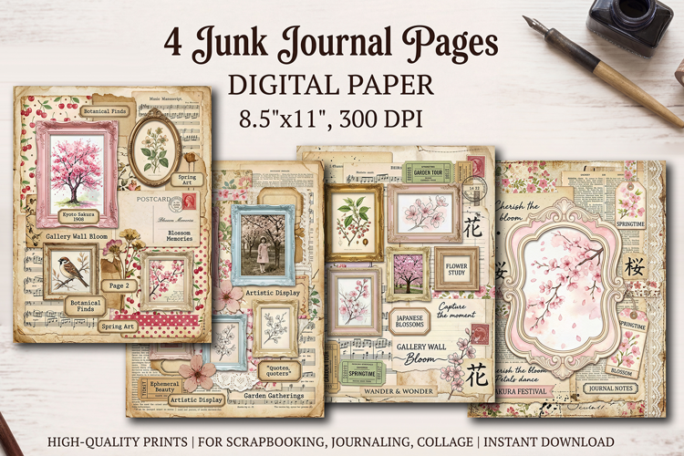 Add enchanting whimsy and charm to your creative projects with this printable set of 4 beautifully designed junk journal pages.