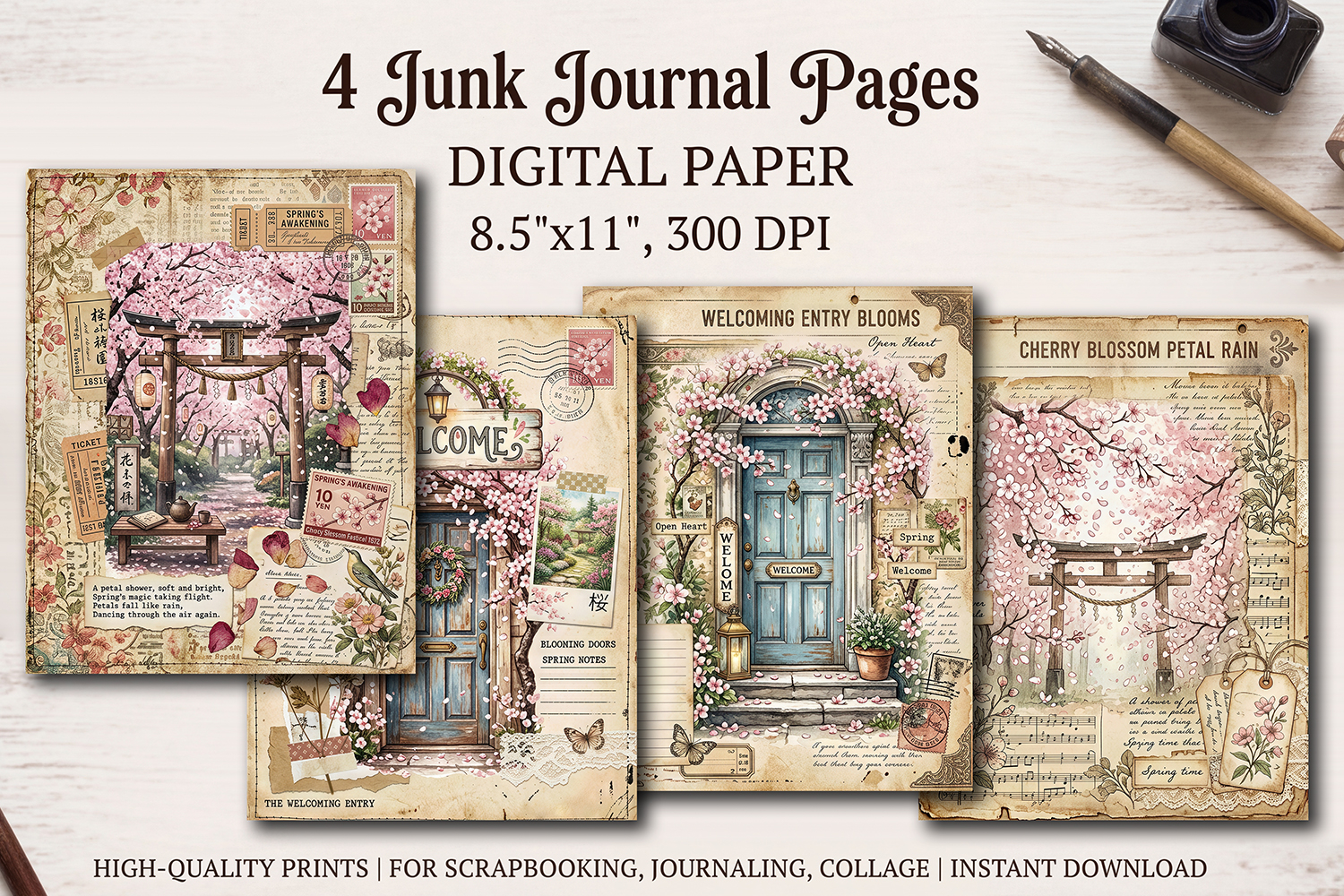 Add enchanting whimsy and charm to your creative projects with this printable set of 4 beautifully designed junk journal pages.