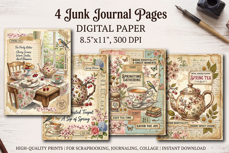 Add enchanting whimsy and charm to your creative projects with this printable set of 4 beautifully designed junk journal pages.