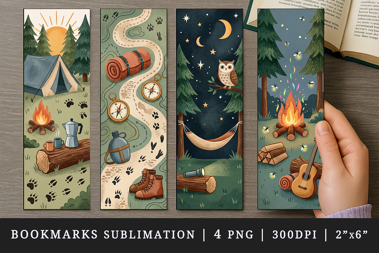 Bookmark Printable Sublimation Design Cute Template Illustration Graduation Gift For Book Lover Read Bookmarks Print Camping Hiking Night Campfire Tent Trail Owl Scene Coffee Backpacking Hammock Bonfire Stovetop Boots Pine Fireflies Maker Bedroll Trees Glowing Mugs Sleeping Forest Acoustic Log Bag Starry Guitar Bench Rolled Sky Camp Gear Crescent Logs Compass