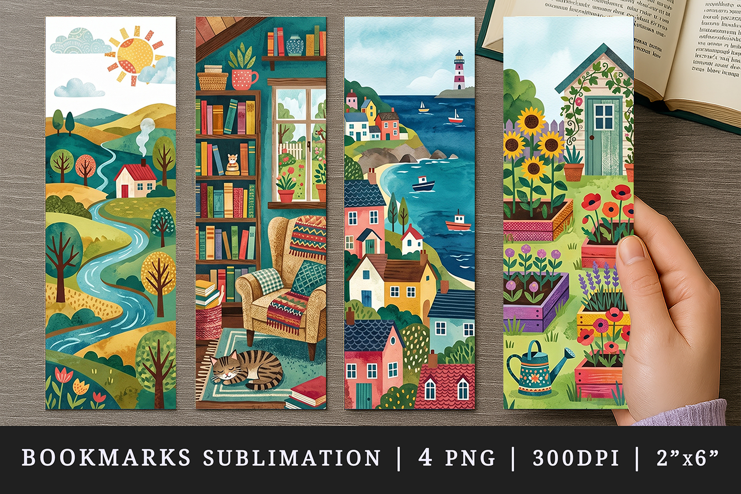 Bookmark Printable Sublimation Design Cute Template Illustration Graduation Gift For Book Lover Read Bookmarks Print Home Countryside Reading Coastal Garden Landscape Nook Village Flower Rural Cozy Seaside Raised Rolling Armchair Lighthouse Beds Hills Blanket Colorful Planter Winding Bookshelf Houses Boxes River Bookcase Fishing Sunflowers Stream Books