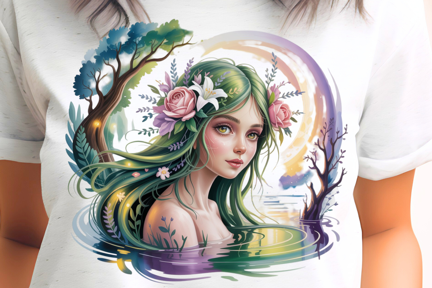 Add a little whimsy enchantment to your projects with the Green Water Fairy with Tree PNG Sublimation, featuring a fairy with flower wreath in a dreamy landscape