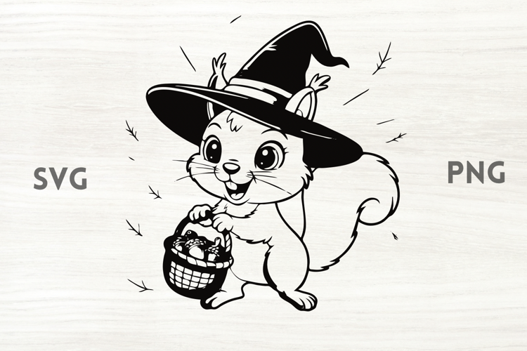 Witchy fall squirrel SVG is a design perfect for Halloween and spooky crafts. Use it on shirts, hoodies, tote bags, cards or any witchy project.