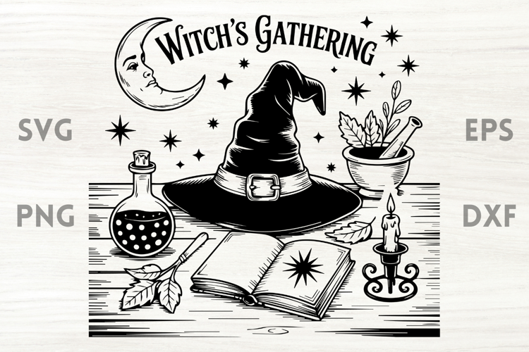 Witch Gathering Hat Potion Moon SVG is an intricate design perfect for Halloween and spooky crafts. Use it for laser cut designs, shirts, hoodies, tote bags, cards or any Halloween decoration