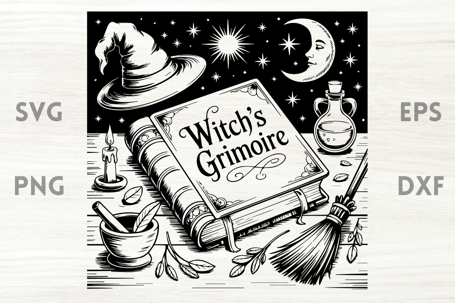 Witch Grimoire Hat Broom Moon SVG