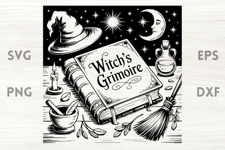 Witch Grimoire Hat Broom Moon SVG example image 1