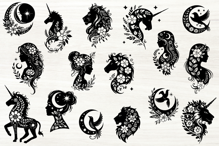 Mythical SVG Bundle is a collection of 16 floral mythical silhouettes: lions, unicorns, birds, moons and fairies.