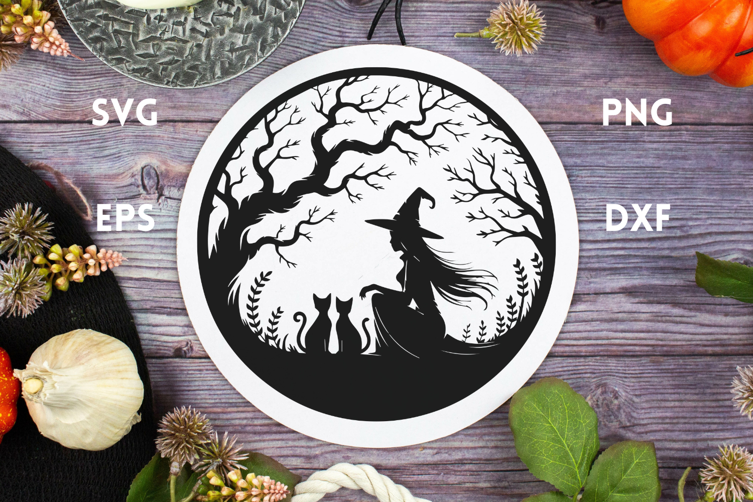 Witch with Cats and tree in EPS, SVG, DXF & PNG format. The cutting points were reduced to a minimum, so the cutting process will be a lot faster.
