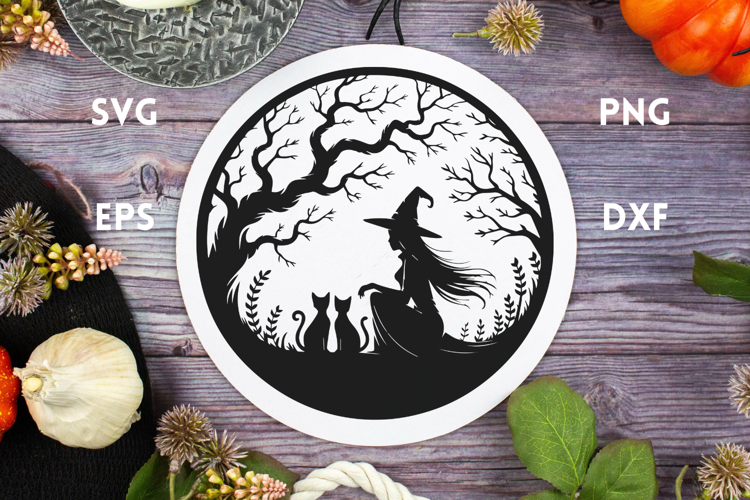 Witch with Cats and forest - Round Halloween Sign SVG is a design perfect for Halloween and spooky crafts. Use it porch decorations, laser cut designs, shirts, hoodies, tote bags, cards or any Halloween decoration