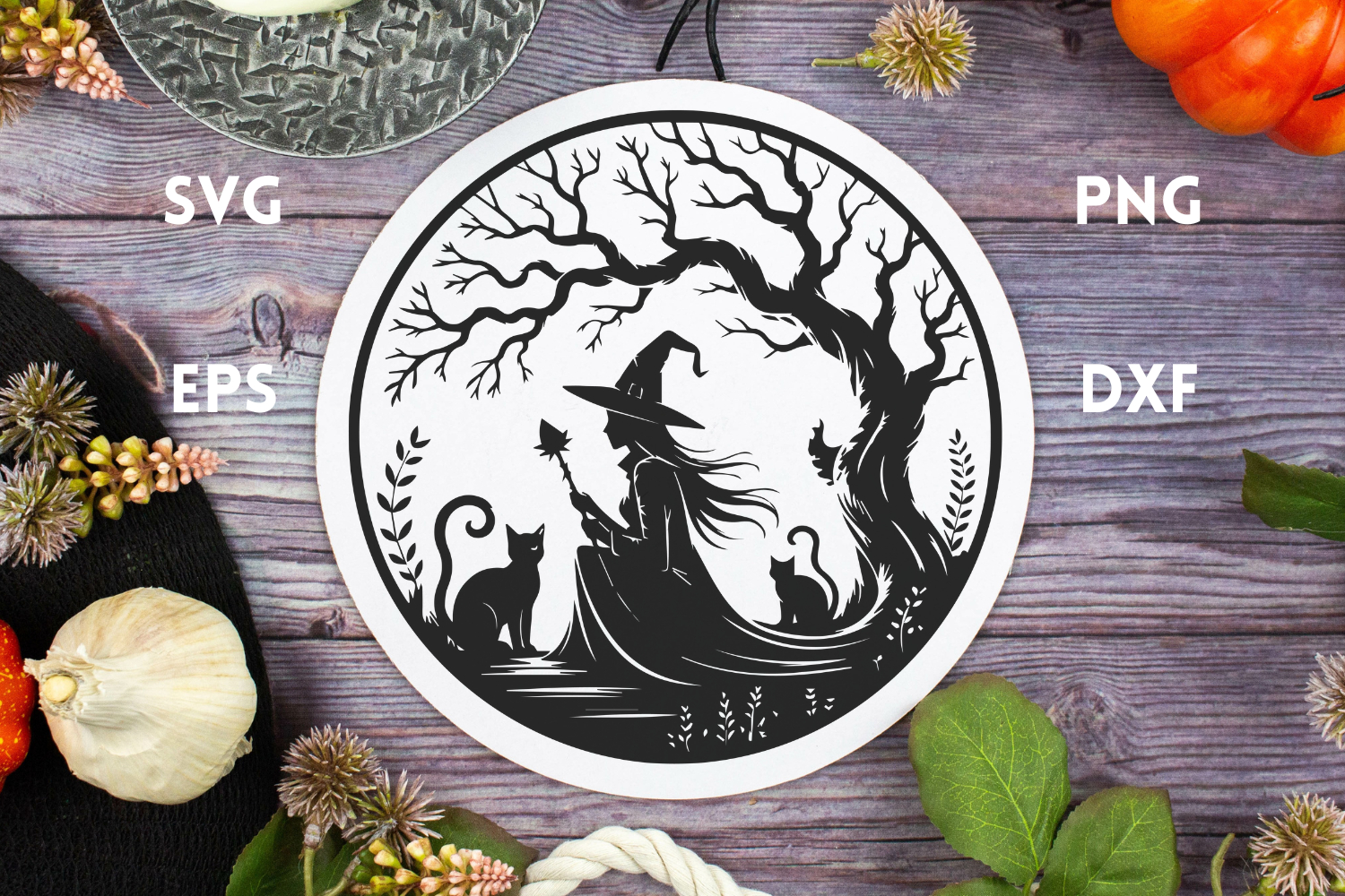 Witch Svg Witchs Hat Black Cat Svg Halloween Decorations Porch Sign Halloween Scene Round Sign Witchy Svg Fall Scene Witch And Cats