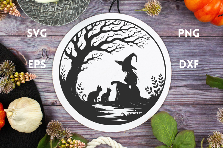 Witch with curious Cats - Round Sign SVG is a design perfect for Halloween and spooky crafts. Use it porch decorations, laser cut designs, shirts, hoodies, tote bags, cards or any Halloween decoration