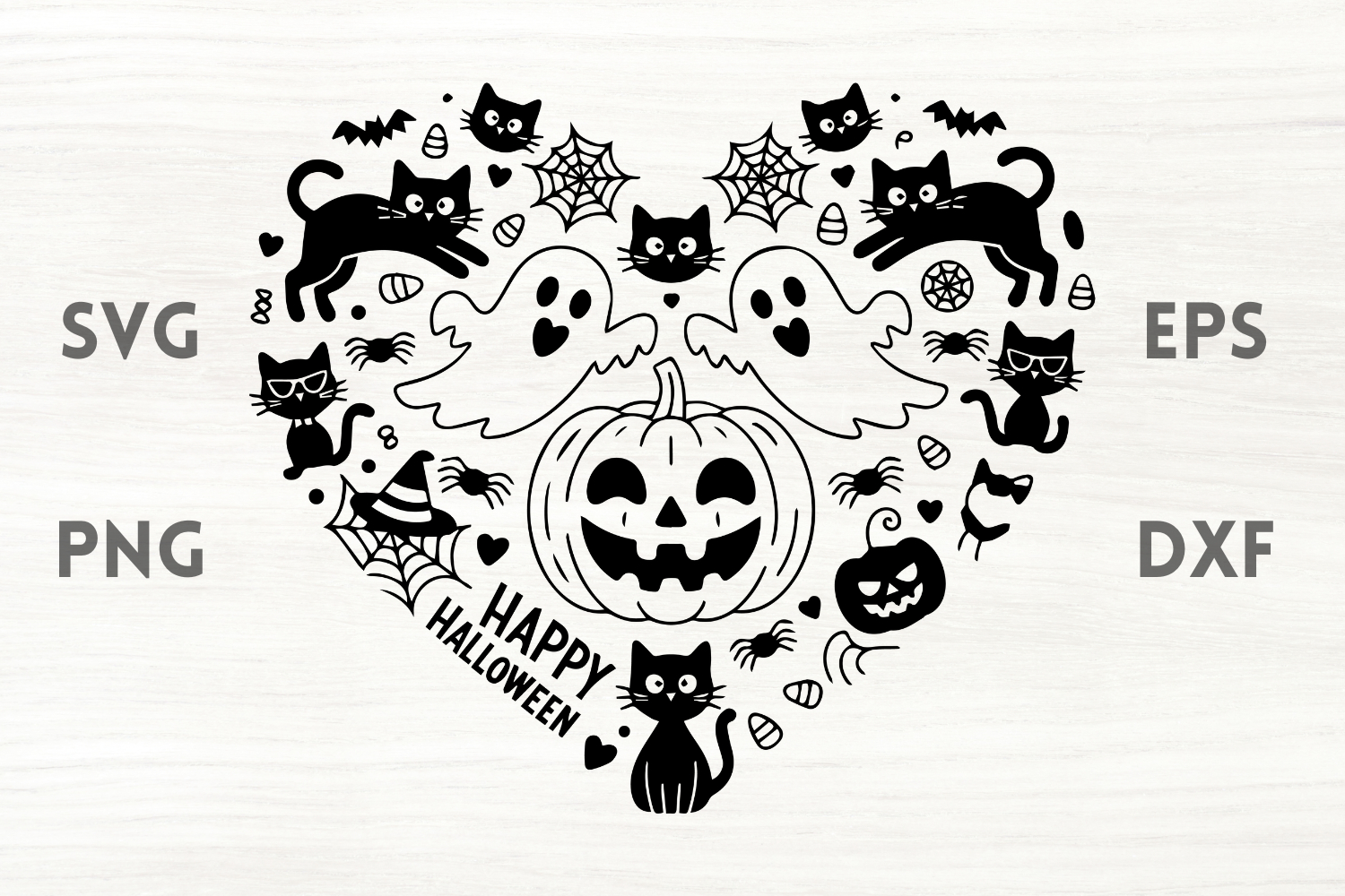 Halloween Party Heart SVG - Cats Ghost and Pumpkin is a design perfect for Halloween and spooky crafts. Use it porch decorations, laser cut designs, shirts, hoodies, tote bags, cards or any Halloween decoration