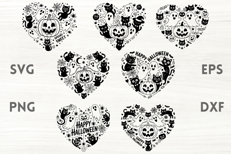 Halloween Party Hearts SVG Bundle is a collection of 7 funny Halloween hearts, with pumpkins, ghosts, cats, spiders and spiderwebs.
