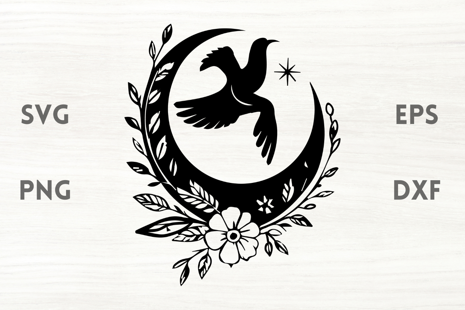 Floral moon and bird SVG is a design perfect for Halloween and celestial/ witchy crafts. Use it decorations, laser cut designs, shirts, hoodies, tote bags, cards or any decoration