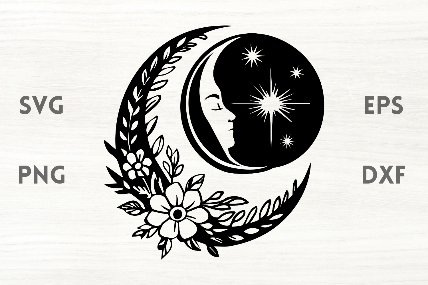 Floral moon face and star is in EPS, SVG, DXF & PNG formats. The cutting points were reduced to a minimum, so the cutting process will be a lot faster.