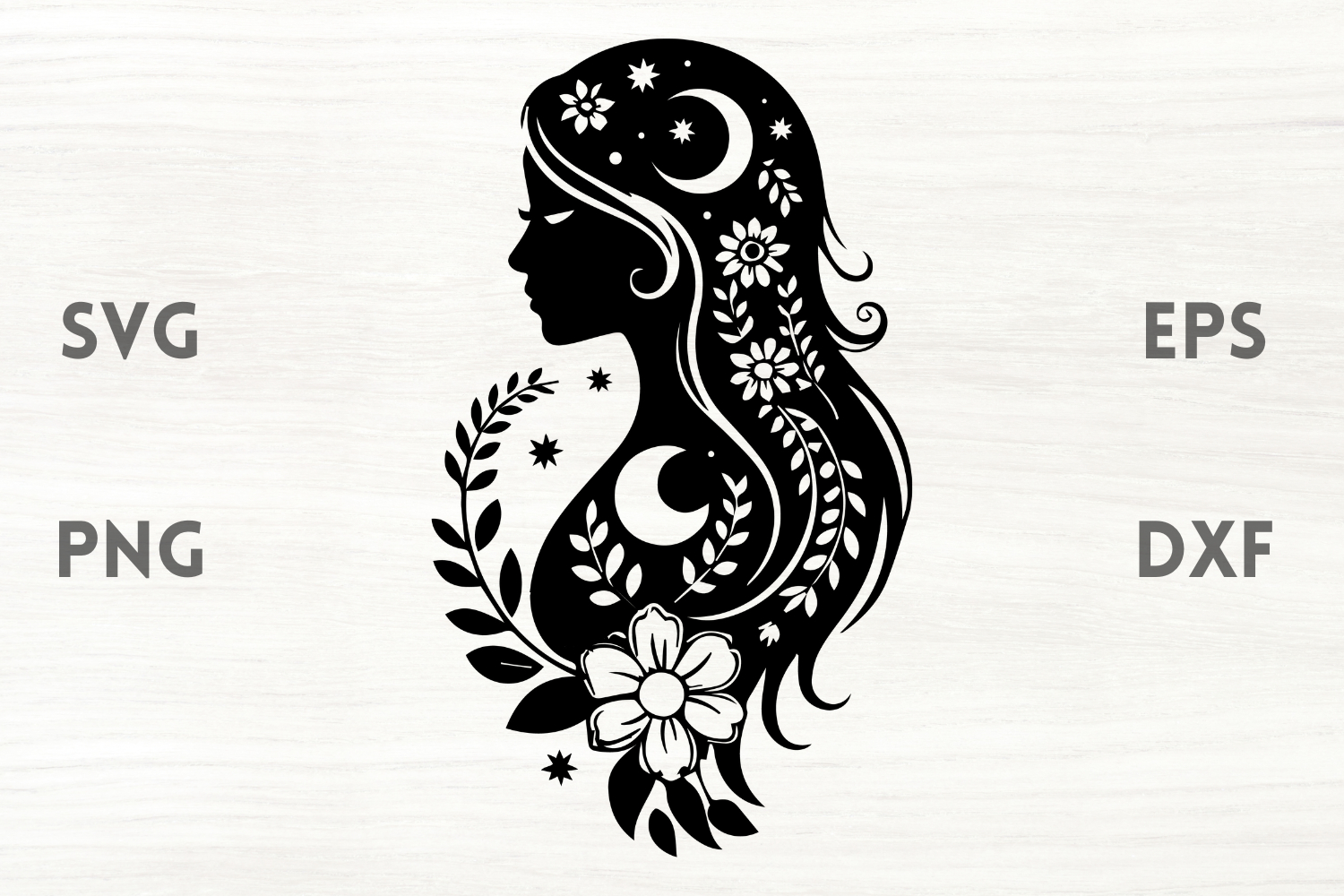 Moon Celestial Floral Lady SVG is a design perfect for Halloween and celestial/ witchy crafts. Use it decorations, laser cut designs, shirts, hoodies, tote bags, cards or any decoration