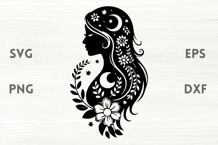 Moon Celestial Floral Lady is in EPS, SVG, DXF & PNG formats. The cutting points were reduced to a minimum, so the cutting process will be a lot faster.