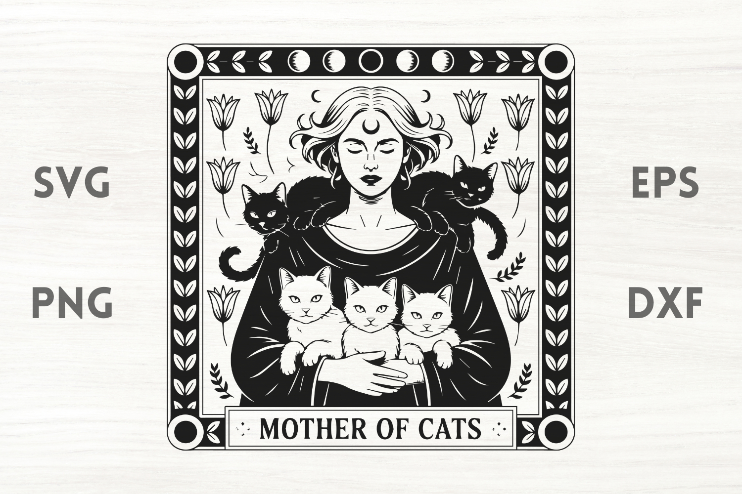 Powerful witch and cats with flowers in EPS, SVG, DXF & PNG format. The cutting points were reduced to a minimum, so the cutting process will be a lot faster.