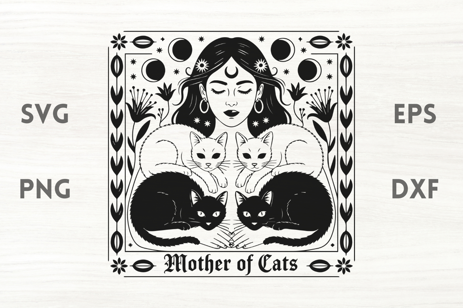 Witch and cats floral in EPS, SVG, DXF & PNG format. The cutting points were reduced to a minimum, so the cutting process will be a lot faster.