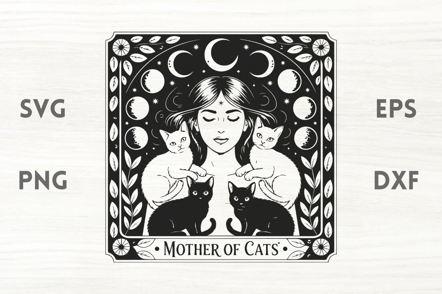 Witch and cats moon phases in EPS, SVG, DXF & PNG format. The cutting points were reduced to a minimum, so the cutting process will be a lot faster.