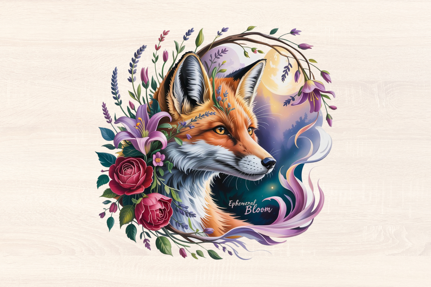 Immerse your projects in whimsy enchantment with the Whimsical Fox with Floral Branch PNG Sublimation, featuring a beautiful fox with roses and lilies.