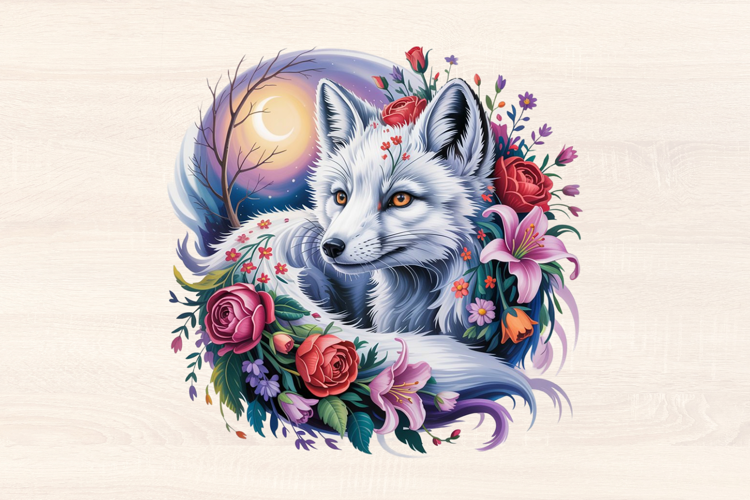 Fantasy Illustration Animal Png Rose Bouquet Arctic Fox Fox Png Moon Png Rose Branch Whimsical Sublimation Enchanting Png Fox With Rose Branch Png Sublimation