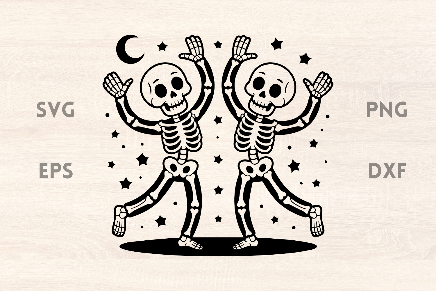 Skeletons Dance Moon and Stars SVG is available in EPS, SVG, DXF & PNG format. The cutting points were reduced to a minimum, so the cutting process will be a lot faster.