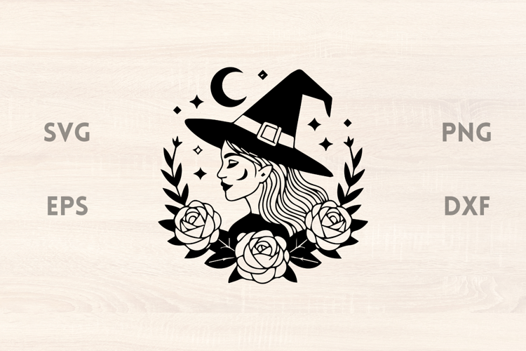 Witch with Rose Wreath SVG is available in EPS, SVG, DXF & PNG format. The cutting points were reduced to a minimum, so the cutting process will be a lot faster.
