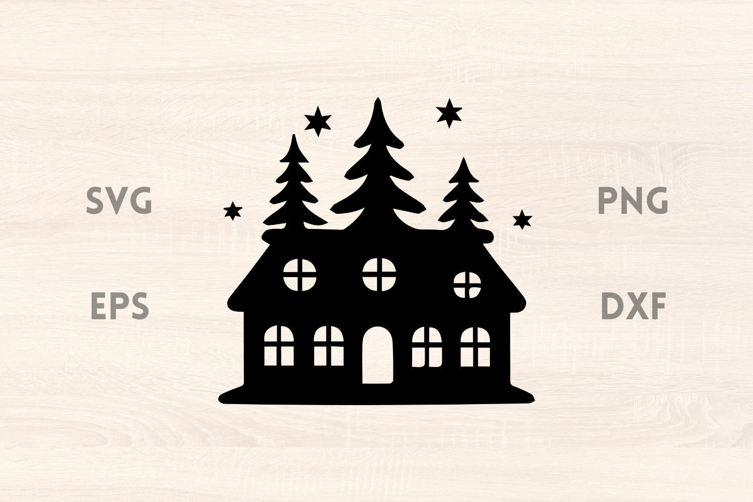 Cottage Svg Festive Svg Christmas Silhouette Christmas Scene Whimsical Christmas Winter Scene Winter Cottage With Trees Svg Scene