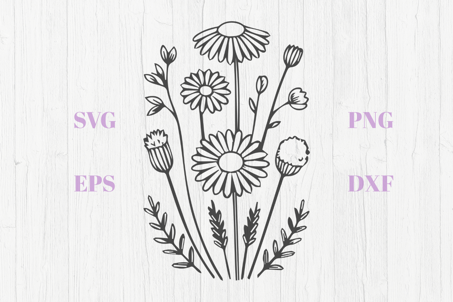 Daisies and wildflowers SVG are in EPS, SVG, DXF & PNG format. The cutting points were reduced to a minimum, so the cutting process will be a lot faster.