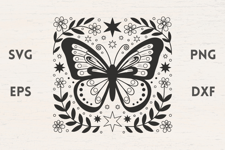 Butterfly illustration with Star flowers and leaves are in EPS, SVG, DXF & PNG format. The cutting points were reduced to a minimum, so the cutting process will be a lot faster.