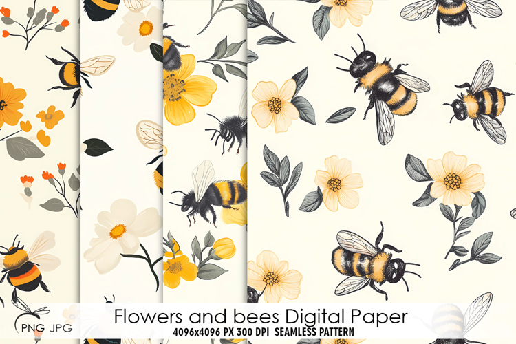 Floral Digital Paper Scrapbooking Scrapbook Paper Flowers Digital Paper Floral Png Bees Seamless Pattern Floral Sublimation Flower Sublimation Bees Digital Paper Flowers And Bees Digital Paper