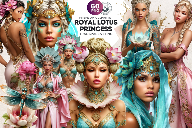 Step into a world of elegance with this collection of 60 high-quality Royal Lotus Princess cliparts. Featuring ethereal goddesses, ornate floral crowns, and mystical creatures like jeweled turtles and swans in a vibrant fantasy style. ✨🌸